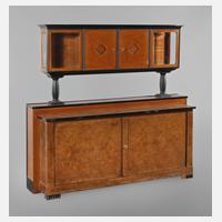 um 1905, Eiche massiv und furniert, aus der Speisezimmereinrichtung III, dunkelbraun gebeizt, Ausführung Vereinigte Werkstätten Dresden Hellerau, zweiteiliger Korpus, originale Eisenbeschläge, ein Schlüsselbeschlag sowie die Handhaben der Auszugplatte fehlen, zwei Scheiben ergänzt, Alters- und Gebrauchsspuren, Maße 168 x 120 x 53 cm. Quelle: Richard Riemerschmid, Vom Jugendstil zum Werkbund, Münchner Stadtmuseum 1983, S. 204.