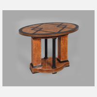 Darmstadt, um 1905, Platanenholz und Perlahorn furniert, Birnbaumholz, schwarz gebeizt, intarsiert mit verschiedenen Hölzern, ovale Platte mit intarsiertem geometrischen Dekor und feiner ornamentaler Bandeinlage, getragen von zwei quadratischen Säulen, auf geschweifter Grundplatte montiert, unrestaurierter Originalzustand, mit normalen Alters- und Gebrauchsspuren, Maße 74 x 103 x 69 cm. Quelle: vgl. Museum Künstlerkolonie Darmstadt, 1989, S. 194-195 und Ausstellungskatalog Landesmuseum Oldenburg.