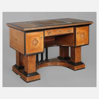 Darmstadt, um 1905, Platanenholz und Perlahorn furniert, Birnbaumholz, schwarz gebeizt, intarsiert mit verschiedenen Hölzern und Perlmutt, frei im Raum stellbarer Schreibtisch, Platte umlaufend mit feinen Bandeinlagen, darunter zwei Türen und Schubkasten, von schwarzen Flammleisten gerahmt, getragen von vier quadratischen Säulen, auf gebogter Grundplatte montiert, Oberfläche mit Alters- und Gebrauchsspuren, Ledereinlage der Platte fehlt, rest.bed., Maße 75 x 120 x 64 cm. Quelle: vgl. Museum Künstlerkolonie Darmstadt, 1989, S. 194-195 und Ausstellungskatalog Landesmuseum Oldenburg.