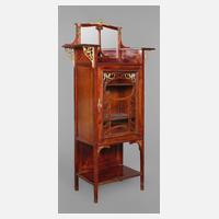 Darmstadt, um 1905, dreiteiliger Korpus, Platanenholz und Perlahorn furniert, Birnbaumholz, schwarz gebeizt, intarsiert mit verschiedenen Hölzern und Perlmutt, Aufsatz mit intarsiertem geometrischen Ornament, die Tür mit Stangenschloss, von Flammleisten gerahmt, seitlich Furnierfehlstellen, Alters- und Gebrauchsspuren, rest.bed., Maße 165 x 175 x 45 cm. Quelle: vgl. Museum Künstlerkolonie Darmstadt, 1989, S. 194-195 und Ausstellungskatalog Landesmuseum Oldenburg.