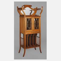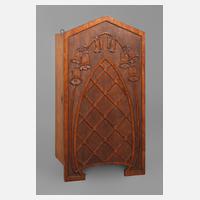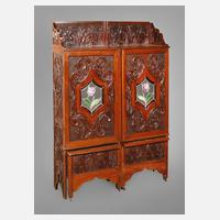 deutsch, um 1900, Eiche massiv, mittelbraun gebeizt, die Front aufwendig mit floraler Oberflächenschnitzerei verziert, geschwungener Aufsatz mit bleiverglaster Tür, innen zwei Regalböden und vier Fächer, darunter zwei Türen mit Facettverglasung, mit Schlüssel, Maße 183 x 90 x 31 cm.