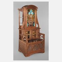 um 1900, Nussbaum furniert und massiv, vermutlich Seitenschränke eines Umbausofas, Türen, Aufsatz und die äußere Seite mit feiner floraler Oberflächenschnitzerei, die sechseckige Türfüllung mit Blumenmotiv in Bleiglas verziert, im Unterteil auf Rollen ausziehbarer Sitz mit klappbarer Platte, rest.bed., Maße je 153 x 57 x 34 cm.