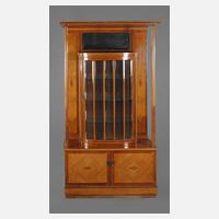 deutsch, um 1905, Mahagoni und Ahorn furniert, geometrische Einlegearbeiten in verschiedenen Edelhölzern und Perlmutt, das Mittelteil mit konvex gebogener Tür und facettgeschliffenen Scheiben, innen drei Glaseinlegeböden, Alters- und Gebrauchsspuren, Schlüssel fehlt, Maße 185 x 94 x 40 cm.