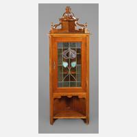 um 1900, Eiche massiv, mittelbraun gebeizt, eintüriges Schränkchen mit originaler Bleiverglasung und abnehmbarem Aufsatz, innen zwei Regalböden, Schlüssel fehlt, eine Scheibe gerissen, Maße 156 x 63 x 33 cm.