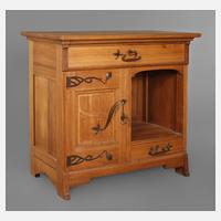 deutsch, um 1900, Eiche massiv, vermutlich Unterteil eines Aufsatzbuffets, eintürig mit großem Schubkasten, darüber ausziehbare Ablage, dekorative kupferfarbene Zierbeschläge, guter Zustand, mit Schlüssel, Maße 100 x 110 x 60 cm.