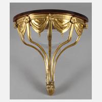 um 1900, durchbrochen gearbeitete Konsole aus feuervergoldetem Messing, mehrteilig gearbeitet und montiert, aufgelegte Platte auf Mahagoni gebeizt, eine Zierstrebe alt repariert, H 36 cm.