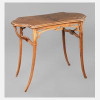 Frankreich, um 1900, Platte mit nachträglicher Signatur E. Gallé Nancy, allseitig geschwungenes Gestell mit durchbrochen gearbeiteter Zarge, die Platte in Vogelaugenahorn furniert, florale Marketerie in verschiedenen Edelhölzern, alt restauriert, Alters- und Gebrauchsspuren, H 75 x B 90 x T 52 cm.