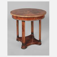um 1905, mahagonifurniert, geometrische Einlegearbeiten in Ebenholz und Perlmutt, runde Platte getragen von fünf gedrechselten Rundsäulen auf rundem Fuß, die Oberfläche mit Alters- und Gebrauchsspuren, rest.bed., H 76 cm, D 80 cm.