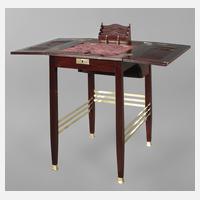 wohl Wien, um 1900, Buche auf Mahagoni gebeizt, Verstrebungen und Beschläge aus poliertem Messing, durch Öffnen der beiden oberen Klappen hebt sich die Briefablage mit Stifthalter, seitlich originale Ledereinsätze (teilweise beschädigt), mittig klappbare Schreibunterlage, darunter Stauraum, restauriert, Maße offen 76 x 92 x 57 cm.