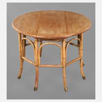 um 1900, an der Zarge mit Firmenetikett Prag Rudniker Korbfabrikation Wien, Maria Hilferstraße 1A, runde Platte aus massiver Eiche, Gestell mit acht Beinen aus Bambus, Füße mit Messingmanschetten, Alters- und Gebrauchsspuren, Oberfläche rest.bed., H 59 cm, D 80 cm.