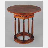 Entwurf um 1905, indischer Palisander auf Nadelholz furniert, runde Platte mit kleiner geometrischer Intarsie in Form einer Darmstädter Rose, Zarge umlaufend mit feiner Würfelmarketerie und ebonisierter Flammleiste, Alters- und Gebrauchsspuren, kleine Furnierfehlstellen, H 66, D 69 cm.