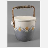 um 1910, Kunstabteilungsmarke Christian Neureuther, weitere Prägemarke und Dekorstempel 5512, Steingut mit schabloniertem geometrischen Dekor und farbloser Glasur, Henkel aus Holz gedrechselt, seitliche Bastwicklung, Alters- und Gebrauchsspuren, H mit Henkel 43 cm.
