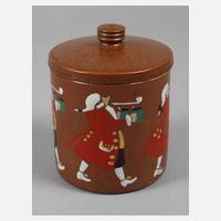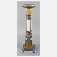 Entwurf um 1910, geritzter Buchstabe Z, hellgraues Feinsteinzeug, Glasur in kölnisch Braun, farbig emailliert, stilisierte Diener mit Krügen und Kerzenleuchter, minimalst bestoßen, H 14 cm.