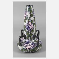 um 1910, grüne Stempelmarke Made in Czecho-Slowakia, unleserliche Modellnummer 1819? Dekornummer E.26., graues Steinzeug, farbig glasiert, vier angesetzte Henkel, Rosenblütendekor, etwas Alterscraquelé, sonst guter altersgemäßer Zustand, H 43 cm.