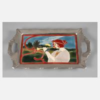 um 1900, Entwurf Carl Sigmund Luber, ungemarkt, Prägemarken R CN, geritzte Modellnummer 5045, Steingut bedruckt und farbig glasiert, Flötenspielerin mit Amsel bei aufgehender Sonne, Nickelmontierung, normale Altersspuren, L 45 cm.