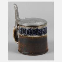 Entwurf von 1910, Ausführung 1. Hälfte 20. Jh., Herstellermarke Reinhold Merkelbach Grenzhausen, Schriftzug Made in Germany, Modellnummer 2026, graues Steinzeug, Bemalung in Kobaltblau und kölnisch Braun, studentische Aufschrift Gaudeamus Igitur, gewölbter martelierter Zinndeckel mit hohem Drücker, guter Zustand, H 18 cm.
