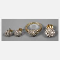 um 1990, Weiß- und Gelbgold gestempelt 585, Damenring mit rundem Ringkopf, D 12 mm, besetzt mit Brillanten im Gesamtgewicht von 1,0 ct, RW 18 mm, einem Anhänger, besetzt mit Brillanten von 1 ct, L 20 mm, und einem Paar Ohrstecker, jeweils besetzt mit Brillanten von ca. 0,5 ct, D 10 mm, G gesamt ca. 14,5 g.