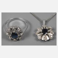 um 1980, Weißgold gestempelt 585, Ring besetzt mit einem facettierten Saphir, umgeben von acht Achtkantdiamanten, RW 17 mm, Anhänger besetzt mit einem facettierten Saphir, umgeben von acht Achtkantdiamanten, L Anhänger 21 mm, an ca. 36 cm langer Kette mit Federringverschluss, G gesamt ca. 7,4 g.