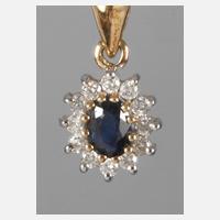um 2000, Weiß- und Gelbgold gestempelt 585, besetzt mit einem oval facettierten Saphir, umgeben von 12 Brillanten, L Anhänger 18 mm, G ca. 1,4 g.