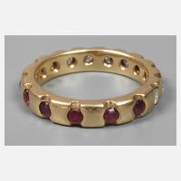 neuzeitlich, Gelbgold gestempelt 750, ca. 4 mm breiter Reif, besetzt mit zehn Brillanten von zusammen ca. 0,5 ct und sechs facettierten Rubinen, RW 17 mm, G ca. 6,2 g.