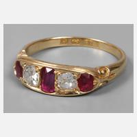 England, um 1900, mehrere Punzen, Gelbgold geprüft 750/1000, Ringkopf, besetzt mit zwei Altschliffdiamanten und drei facettierten Rubinen, RW 17 mm, G ca. 3,2 g.
