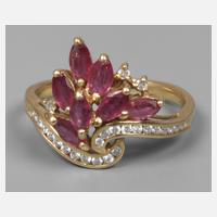neuzeitlich, Gelbgold gestempelt 750, ca. 15 mm hoher Ringkopf, besetzt mit sieben Rubinnavetten und 27 Kleinbrillanten, Tragespuren, RW 18 mm, G ca. 4,1 g.