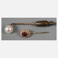 1. Hälfte 20. Jh., Gelbgold geprüft 585/1000, besetzt mit einer Perle von D 7 mm, Verschluss kein Gold, L Nadel 62 mm und Reversnadel mit facettiertem Granat, umgeben von Saatperlen, L ca. 4 mm, G Nadel gesamt ca. 2 g.