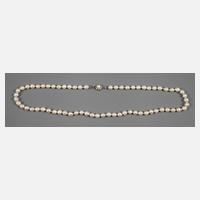 2. Hälfte 20. Jh., Verschluss Silber gestempelt 835, besetzt mit einer Perle, umgeben von facettierten Glassteinen, Kette aus einzeln geknoteten, leicht tropfenförmigen Zuchtperlen mit Wachstumsmerkmalen, L ca. 67 cm, G ca. 61,2 g.