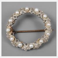 um 1970, Weißgold geprüft 585/1000, ca. 12 mm hoher Ringkopf, besetzt mit einer Perle, umgeben von acht Brillanten im Gesamtgewicht von ca. 0,25 ct, leichte Tragespuren, RW 17 mm, G ca. 5,3 g.