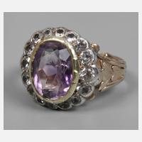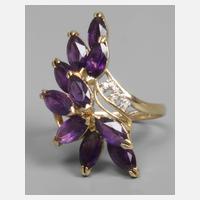 Ende 20. Jh., Gelbgold gestempelt 14 K = 585/1000, ca. 31 mm hoher Ringkopf, besetzt mit zehn Amethystnavetten sowie drei Diamantrosen, RW 18 mm, G ca. 6,2 g.
