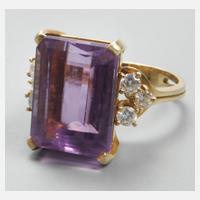 Ende 20. Jh., Gelbgold gestempelt 18 K = 750/1000, ca. 17 mm hoher Ringkopf, besetzt mit einem facettierten rechteckigen Amethyst im Treppenschliff, flankiert von insgesamt sechs Brillanten, im Gesamtgewicht von ca. 0,25 ct, leichte Tragespuren, RW 17 mm, G ca. 7,9 g.