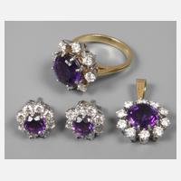 um 1980, Weiß- und Gelbgold gestempelt 585, bestehend aus einem Ring, besetzt mit einem feinen Amethyst von ca. 3,6 ct, umgeben von acht Brillanten von ca. 1,03 ct, RW 17 mm, einem Anhänger, besetzt mit einem Amethyst von 2,9 ct, umgeben von zehn Brillanten von zusammen 0,7 ct und einem Paar Ohrringen, besetzt mit jeweils einem Amethyst, umgeben von zusammen 16 Brillanten im Gesamtgewicht von ca. 1,34 ct, G gesamt ca. 13,1 g, beigegeben Zertifikat.