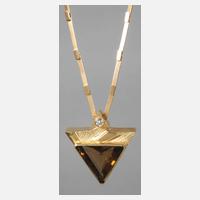 datiert 1992, Gelbgold gestempelt 750 und Schriftzug Handarbeit, Mittelteil besetzt mit einer dunklen Citrintriangel von ca. 23 ct und einem Brillanten von ca. 0,1 ct, je in Zargenfassung, Schmuckgliederkette mit Verlängerungsstück und Karabinerverschlüssen, L gesamt ca. 44 cm, G ca. 34 g, beigegeben Originalrechnung der Goldschmiede Groth/Erbach im Odenwald.