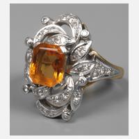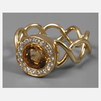 2. Hälfte 20. Jh., Weiß- und Gelbgold gestempelt 750, ca. 23 mm hoher, durchbrochen gearbeiteter Ringkopf, besetzt mit einem facettierten Citrin, umgeben von zahlreichen Kleinstbrillanten, leichte Tragespuren, RW 18 mm, G ca. 10,4 g.