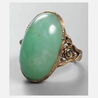 Ende 19. Jh., Gelbgold geprüft 585/1000, ca. 26 mm hoher Ringkopf, besetzt mit einem intensiv grünen Chrysoprascabochon, flankiert von je einer Diamantrose, Schiene teilweise durchbrochen gearbeitet und floral verziert, leichte Tragespuren, RW 18 mm, G ca. 9,9 g.