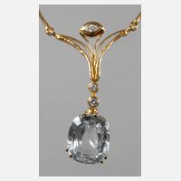 um 1980, Gelbgold geprüft 585/1000, Mittelteil besetzt mit einem facettierten Aquamarin im Antikschliff von 15 x 13 mm, einer Diamantnavette von ca. 0,1 ct und zwei Brillanten von zusammen ca. 0,08 ct, an Stäbchenkette, aufwendige Goldschmiedearbeit – Unikat, Kettenlänge gesamt ca. 48 cm, G ca. 18,6 g.