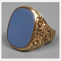 2. Hälfte 20. Jh., Gelbgold gestempelt 585, ca. 22 mm hoher Ringkopf, besetzt mit einem ungravierten Lagenachat, seitlich florales Dekor, minimale Tragespuren, RW 18 mm, G ca. 16,1 g.