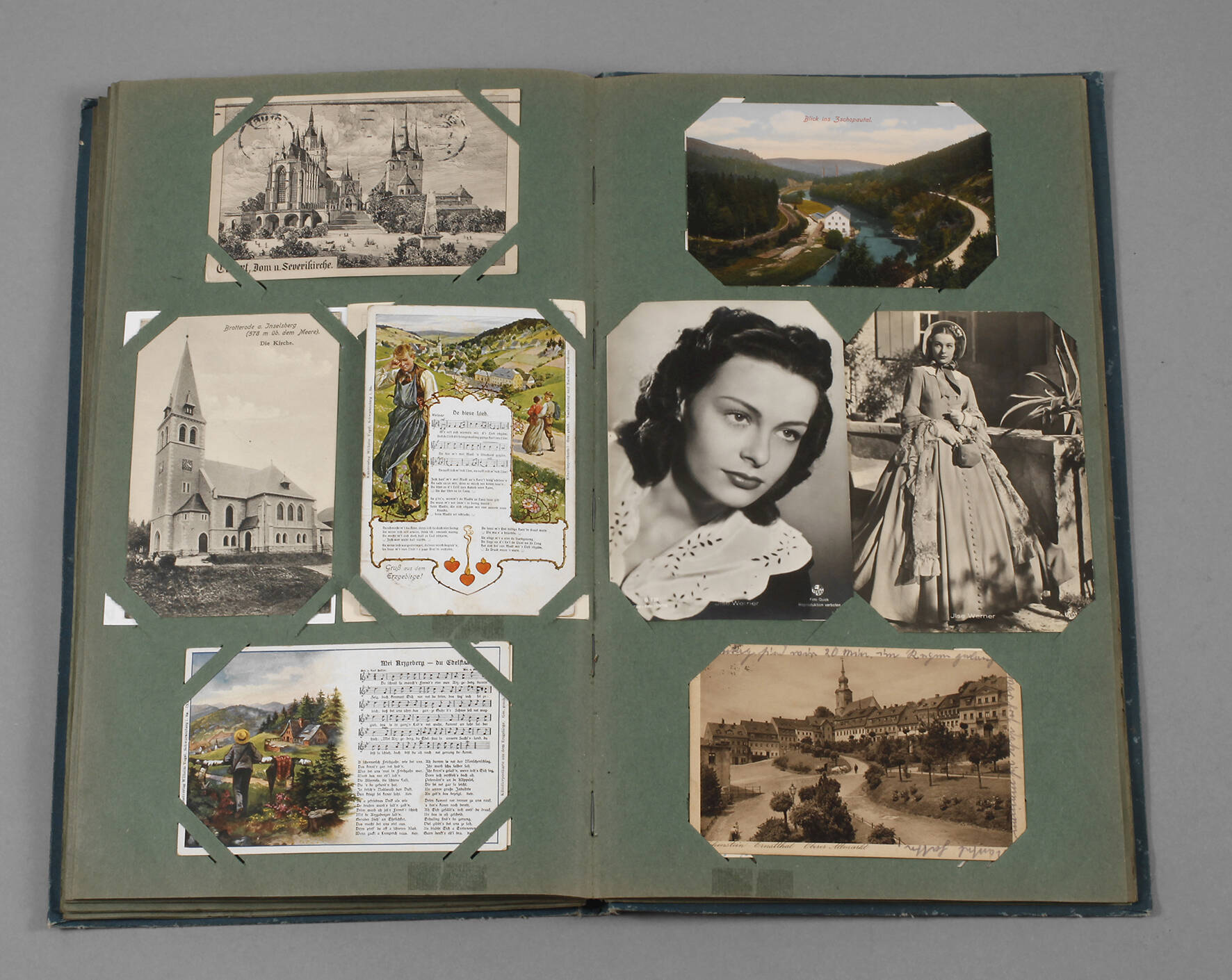 vor 1945, ca. 165 Schauspielerkarten, Kunstpostkarten und topographische Ansichtskarten, einige farbig lithographiert, darunter: Bismarckturm Stettin-Gotzlow, Frankfurt a. d. Oder Löweninsel, Waren/Müritz, Blick ins Zschopautal, Wartburg /Bergfried, Riesa/Klosterkirche, Schloss Weesenstein, Schwarzburg/Blick vom Trippstein, Schrammsteinbaude, Zittau/Stadtgärtnerei, in dekorativem Jugendstilalbum, Altersspuren, H ca. 39 cm.