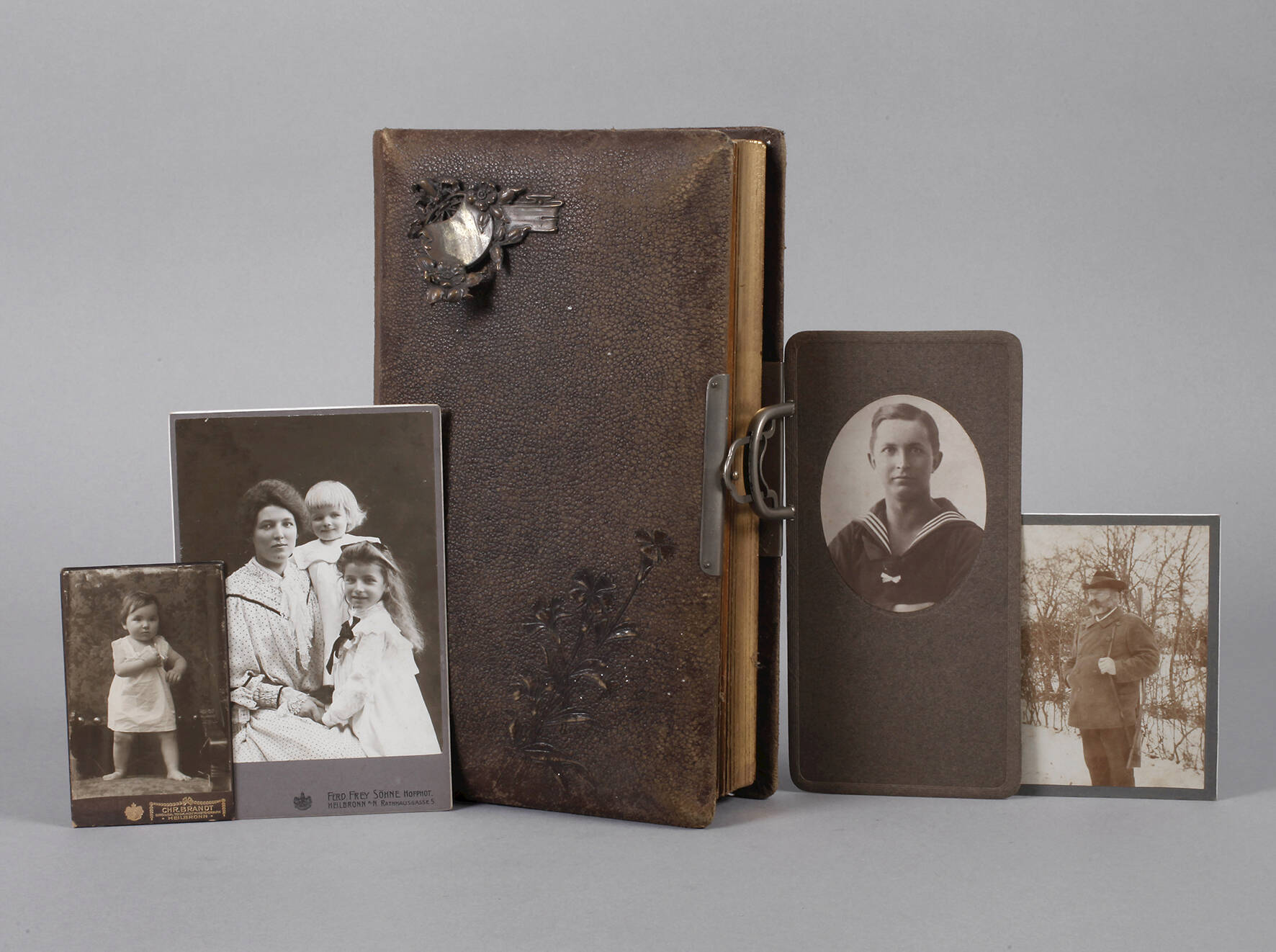 Aufnahme der Villa Mahr in Ilmenau (ehemals Villa des Badearztes Emil Preller) sowie ca. 60 Fotografien im Visit- und Kabinettformat, Lederalbum der Zeit, altersgemäße Erhaltung, H ca. 27,5 cm.