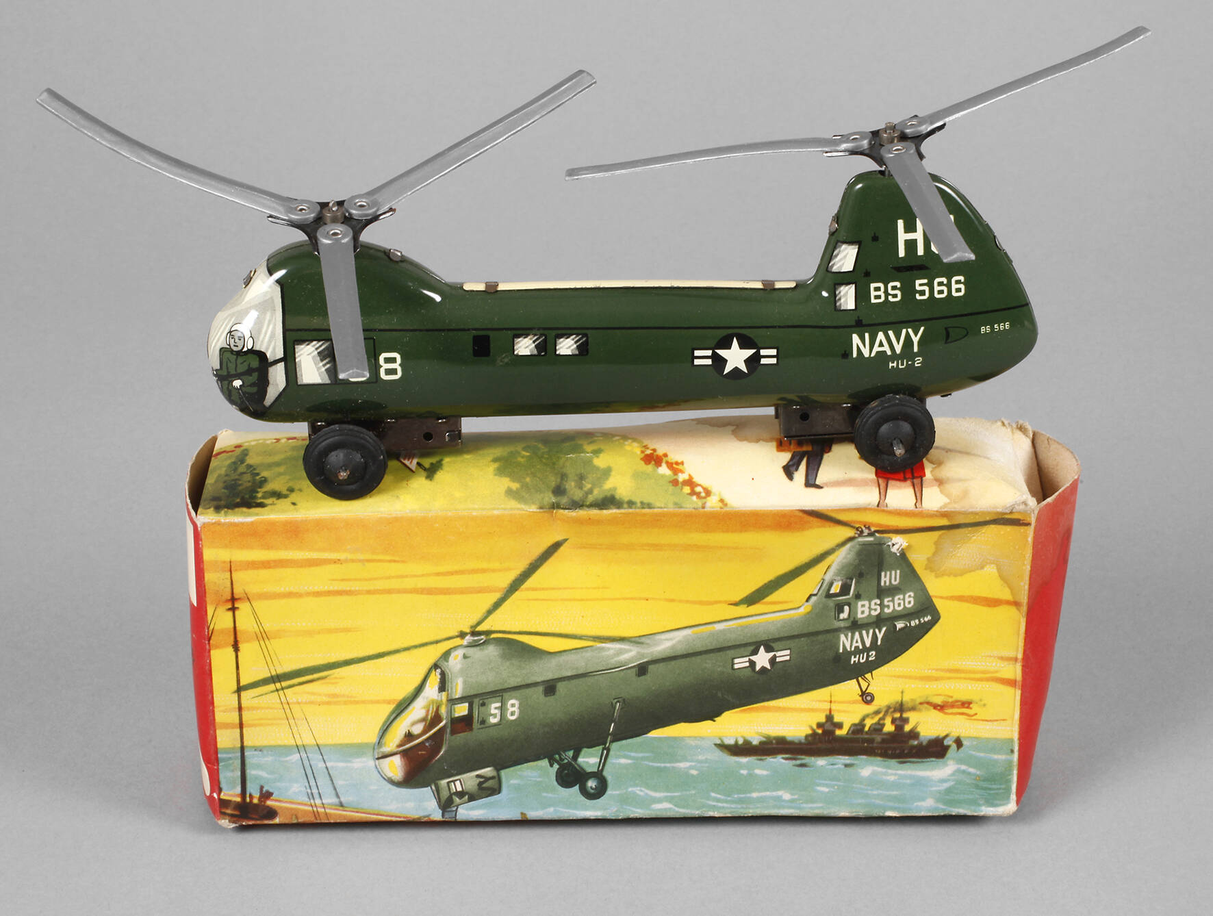 1960er Jahre, gemarkt, betitelt und bezeichnet Made in Western-Germany, Blech farbig lithografiert sowie Kunststoff, als grüner Navy Helicopter Hu-2 BS 566 mit intaktem Friktionsantrieb und beweglichem Doppelrotor, Gummirädern sowie Originalkarton, dieser fleckig, sonst kaum bespielter Zustand, L 20 cm.
