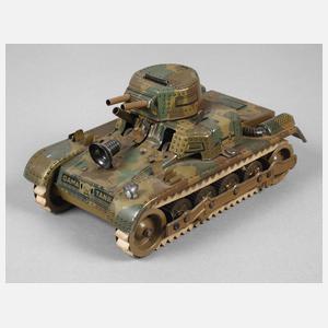 um 1940, gemarkt und bezeichnet D.R.G.M. sowie Made in Germany, Blech in Mimikry lithografiert, Panzer mit intaktem Uhrwerksantrieb, Stopp-Go-Schalter, batteriebetriebenem Scheinwerfer (Funktion nicht geprüft), verstellbarer Doppelkanone mit Funkenflug, drehbarem Turm mit Scharnierdeckel und weiterer Doppelkanone sowie Gummiketten, bespielter und nicht ganz kompletter Zustand, L 19 cm.
