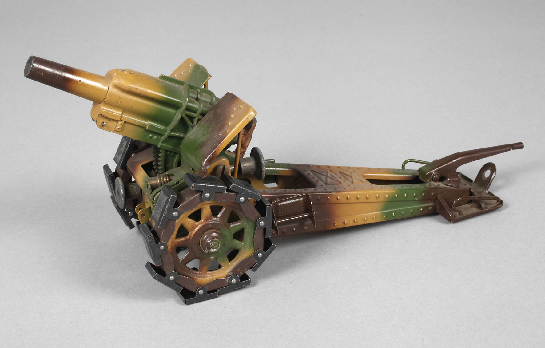 Modell 822, um 1940, ungemarkt, Blech und Gussrohr in Mimikry lackiert, höhen- und seitenjustierbares Geschütz für Amorces-Feuerung mit intakter Federspannung und Schild, Lafette mit Laufplatten sowie klappbaren Trittflächen und Richtbaum, bespielter Zustand, Verschluss korrodiert und Abzug klemmt etwas, L 28,5 cm.