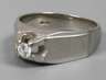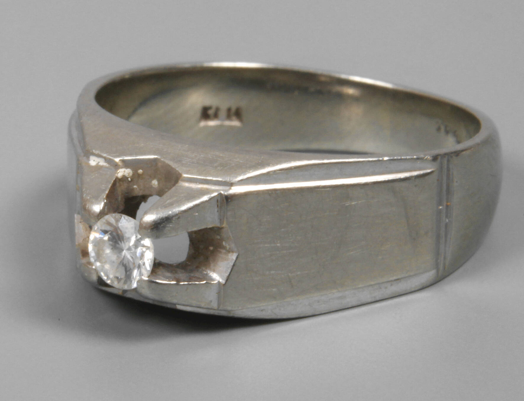 2. Hälfte 20. Jh., Weißgold gestempelt KT 14 = 585/1000, sich leicht verbreiternde Ringschiene, besetzt mit einem Brillant von ca. 0,15 ct, leichte Tragespuren, RW 18 mm, G ca. 6,4 g. Beigegeben Schmuckpass und Rechnung aus dem Jahr 1977.