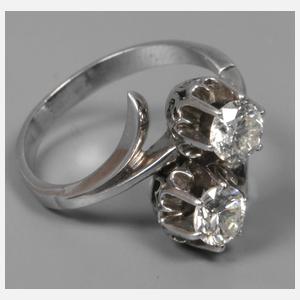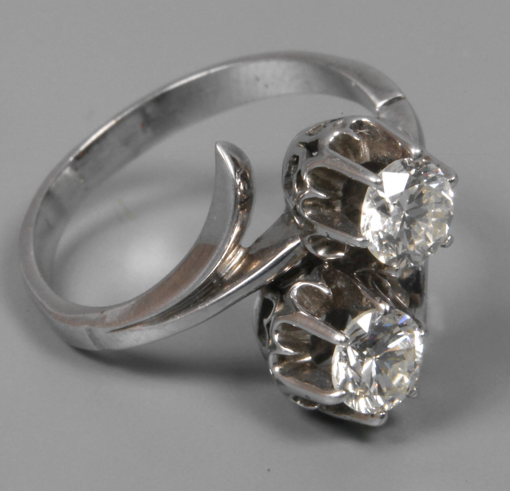 um 1980, Weißgold geprüft 750, ca. 15 mm hoher Ringkopf in Form zweier stilisierter Blüten und Blätter, besetzt mit zwei Brillanten von zusammen ca. 0,8 ct von guter Qualität, in Krappenfassung, RW 17,5 mm, G ca. 4,6 g.