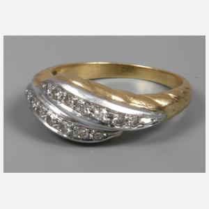 um 2000, Gelbgold gestempelt 750, besetzt mit 14 Achtkantdiamanten von zusammen ca. 0,15 ct, leichte Tragespuren, RW 17,5 mm, G ca. 5,5 g.