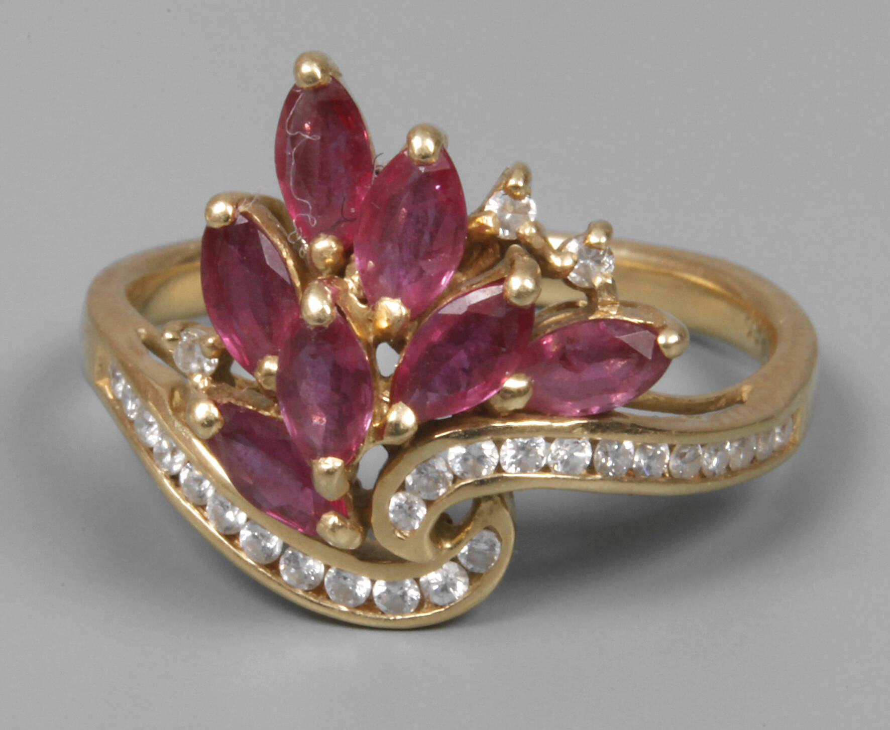 neuzeitlich, Gelbgold gestempelt 750, ca. 15 mm hoher Ringkopf, besetzt mit sieben Rubinnavetten und 27 Kleinbrillanten, Tragespuren, RW 18 mm, G ca. 4,1 g.