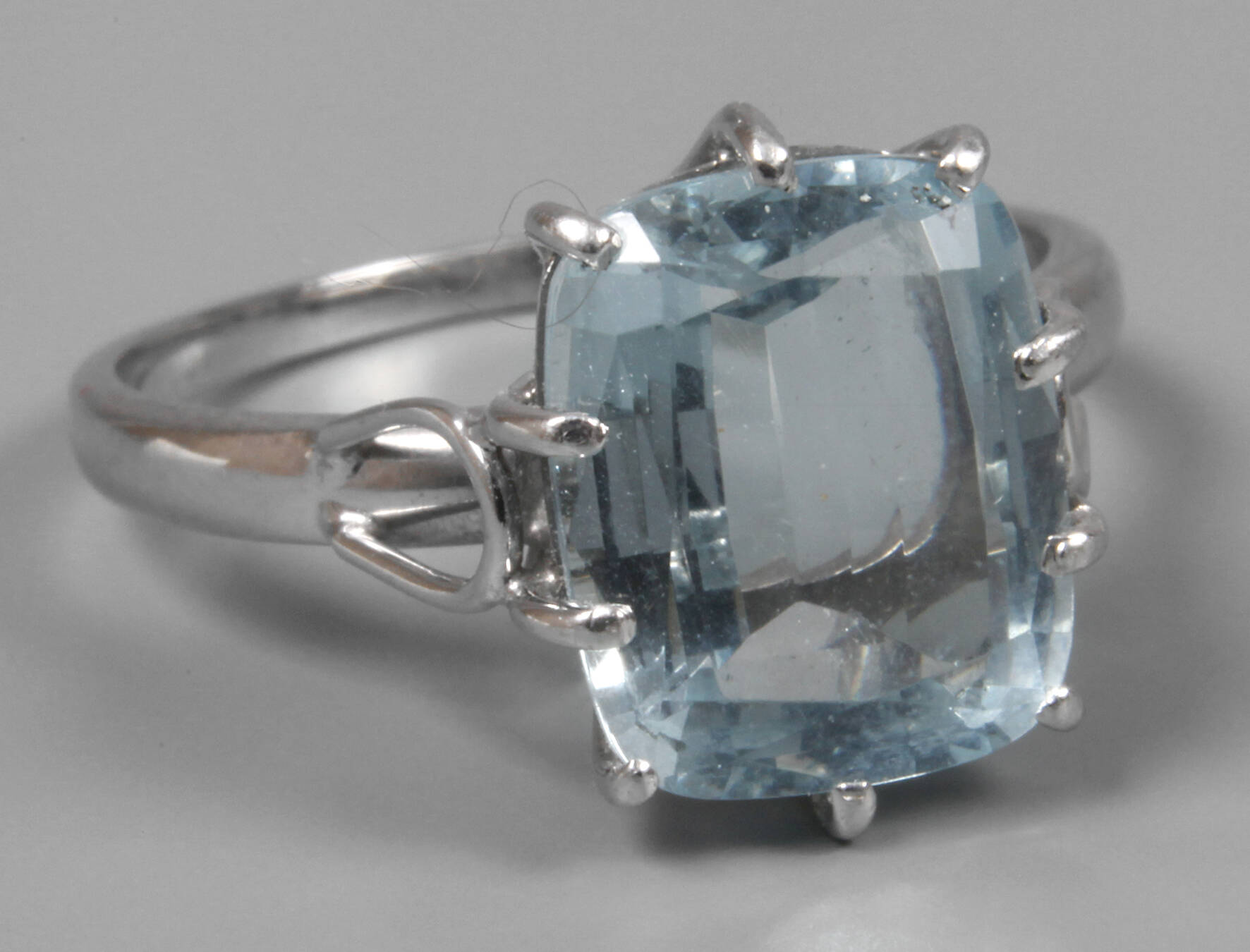 neuzeitlich, Weißgold geprüft 750/1000, besetzt mit einem Aquamarin von ca. 12 x 10 mm in Krappenfassung, RW 19,5 mm, G ca. 4,8 g.