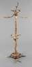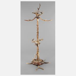 um 1900, aus massiven Hirschgeweihen gefertigt, Mittelsäule bestehend aus 16 Hirschhornrosen, gedrechselter Rundfuß, partiell mit alten Wurmlöchern, Altersspuren, H 200 cm.