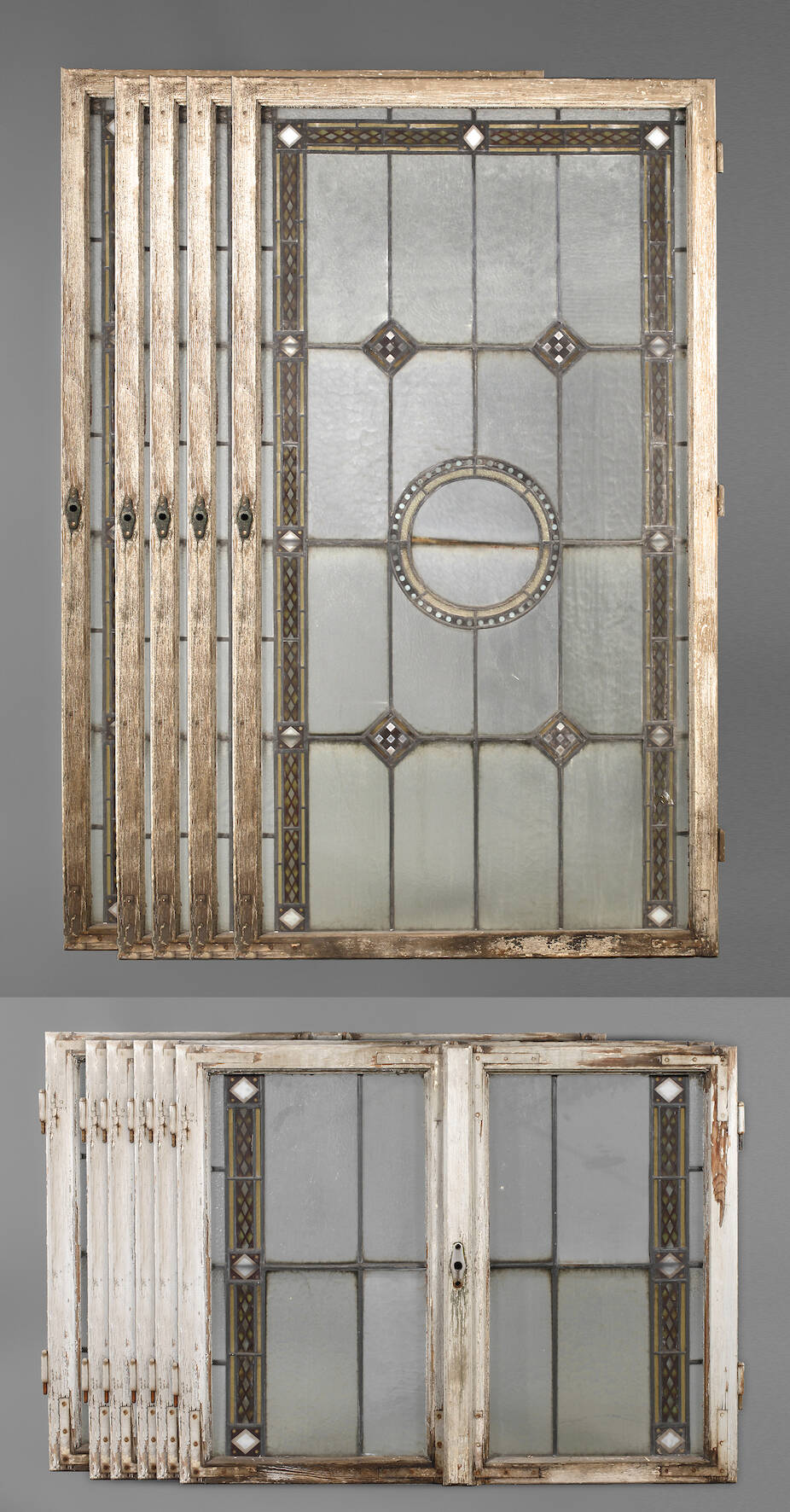 um 1900, bestehend aus fünf großen Fensterflügeln und zwölf kleinen Fensterflügeln, jeweils paarweise zueinander passend, geometrischer Dekor, mit handgemalter Bordüre, Holzrahmen teils stärker verwittert, Scheiben teilweise beschädigt, Maße 186 x 99 cm und 80 x 53 cm.