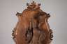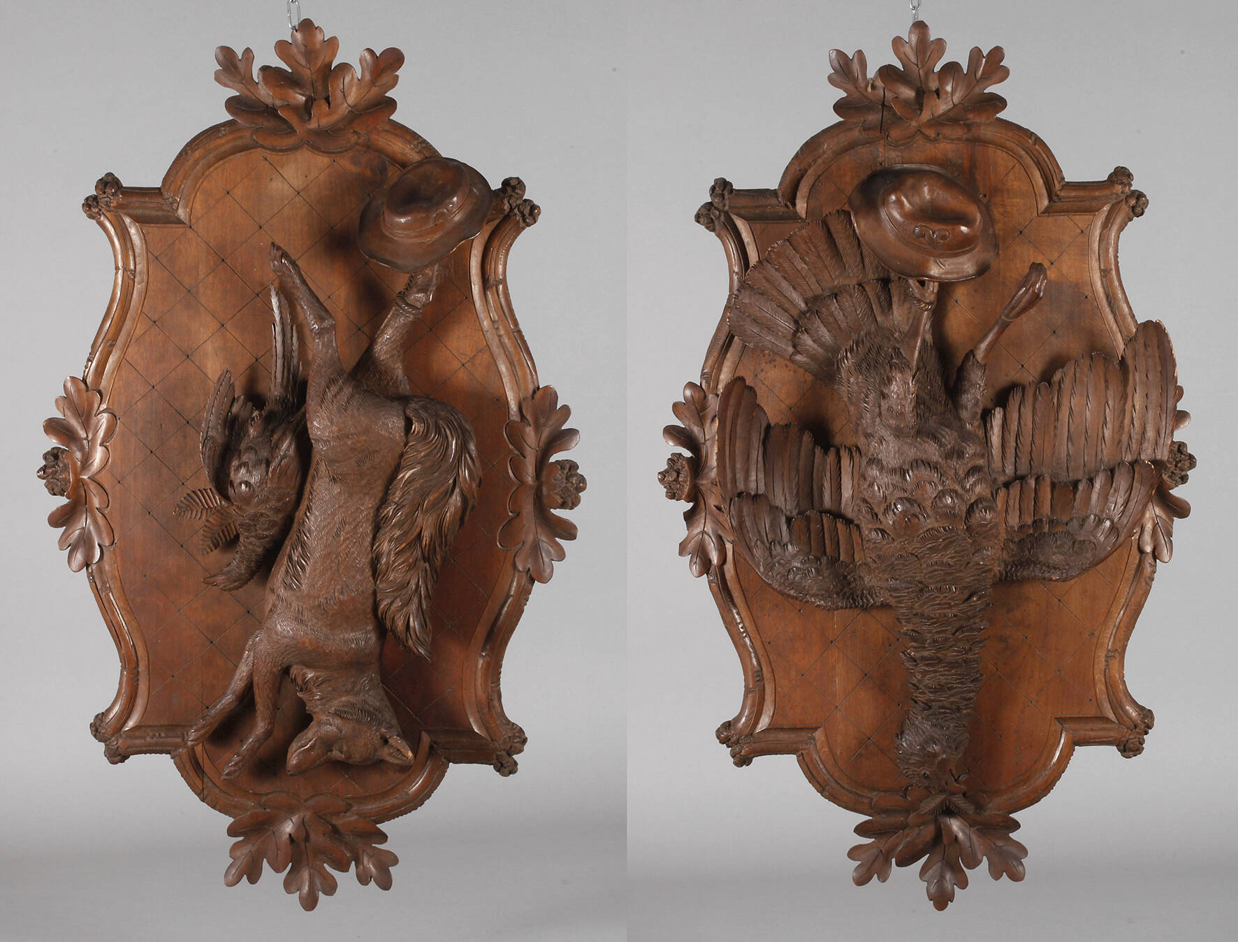 um 1900, ungemarkt, Nussbaum geschnitzt, dunkel gebeizt, passig geschweifte Wandplatten, verziert von Eichenlaub, mit plastisch gearbeiteten Darstellungen eines erlegten Fuchses bzw. einer Wildente, leichte Altersspuren, H je 90 cm.